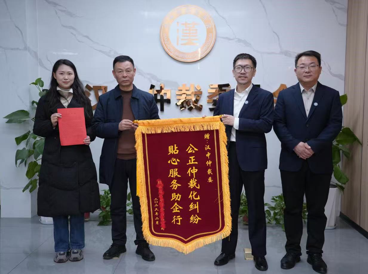 近日,汉中某国有企业相关负责人一行专程来到汉中仲裁委员会,将一面绣有“公正仲裁化纠纷贴心服务助企行”的鲜红锦旗郑重送到工作人员手中,以此感谢汉中仲裁委多年来的坚守与助力,成功化解企业十余载的产权办证难题,有效避免了国有资产流失。